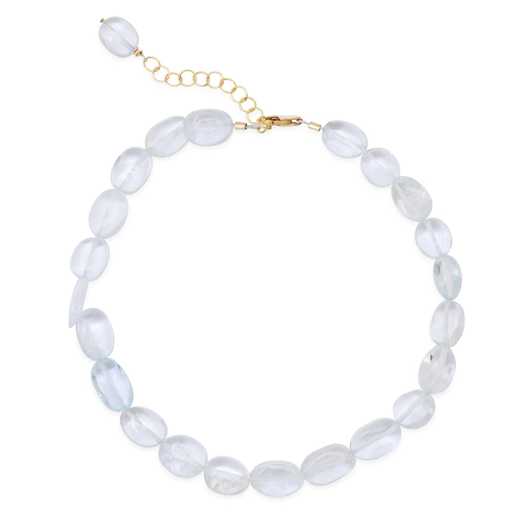 Enhance your sundress and strappy sandals with this oceanic aquamarine anklet. Polished, translucent pebbles wrap around your ankles, giving the lower leg and feet some flair. Derived from the Latin term aqua marinus, meaning "water of the sea," aquamarine comes in a vibrant array of ocean hues and is primarily mined in Brazil.