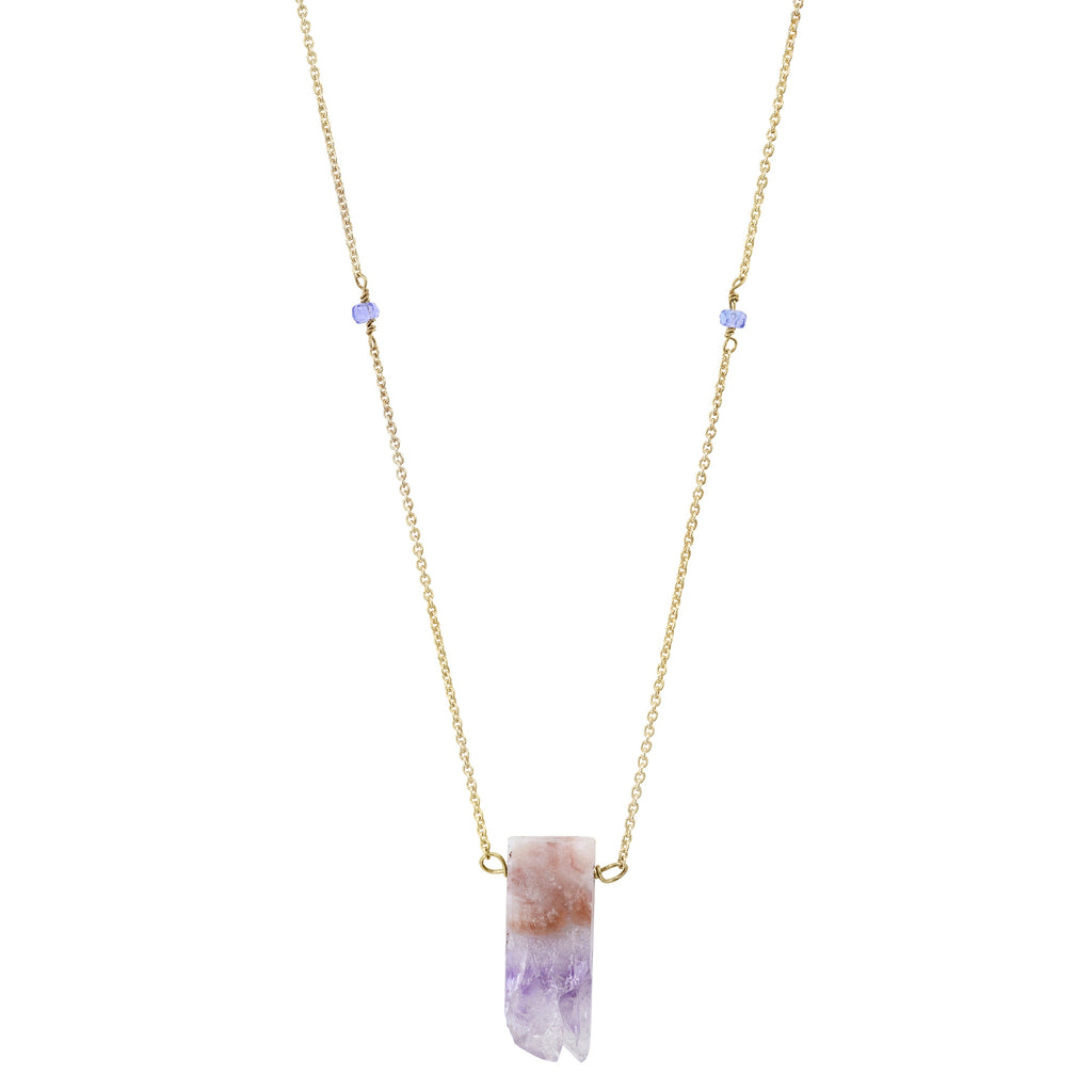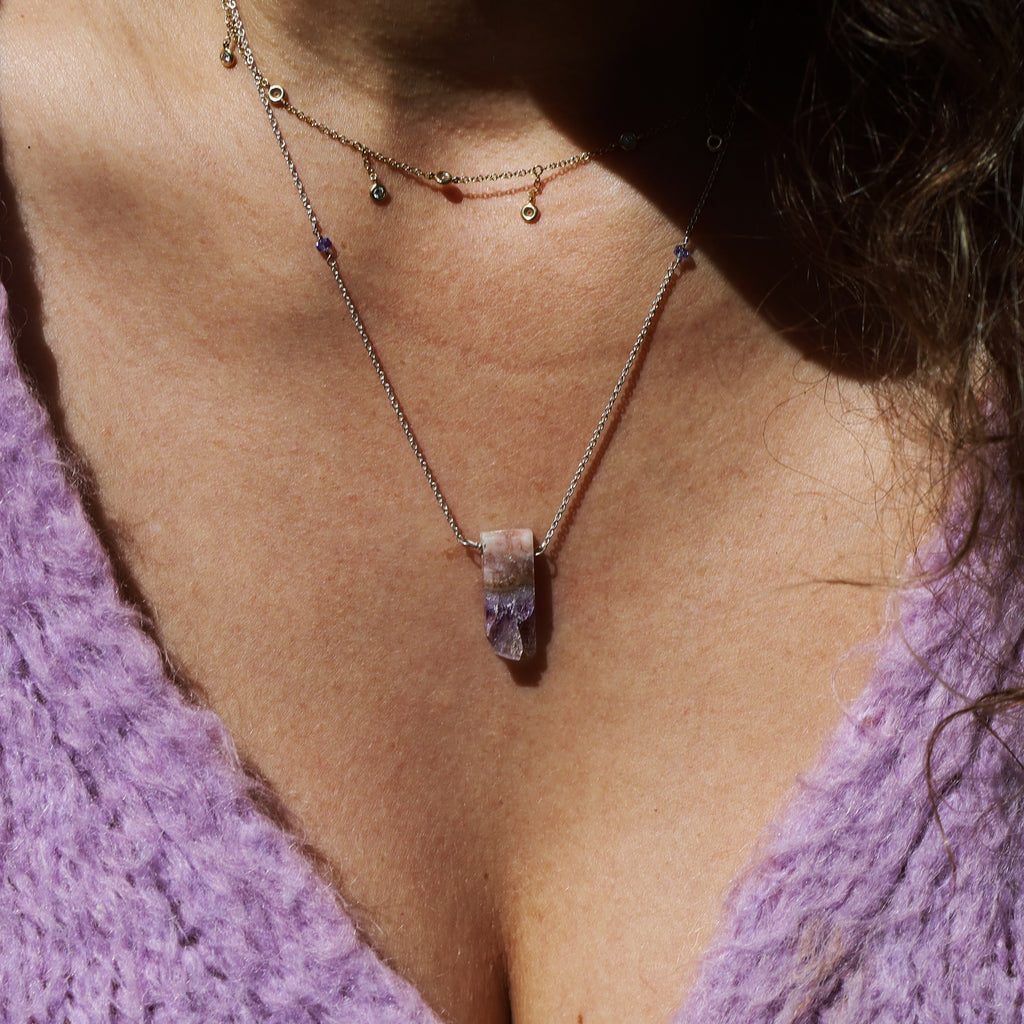 Here we have another stunning creation from Mother Nature herself, the amethyst slice necklace. These stunning amethyst crystals are sourced from South America, and no two are the exact same. The necklace sits at collarbone height just above the heart.  The necklace pairs well with our amethyst slice earrings.