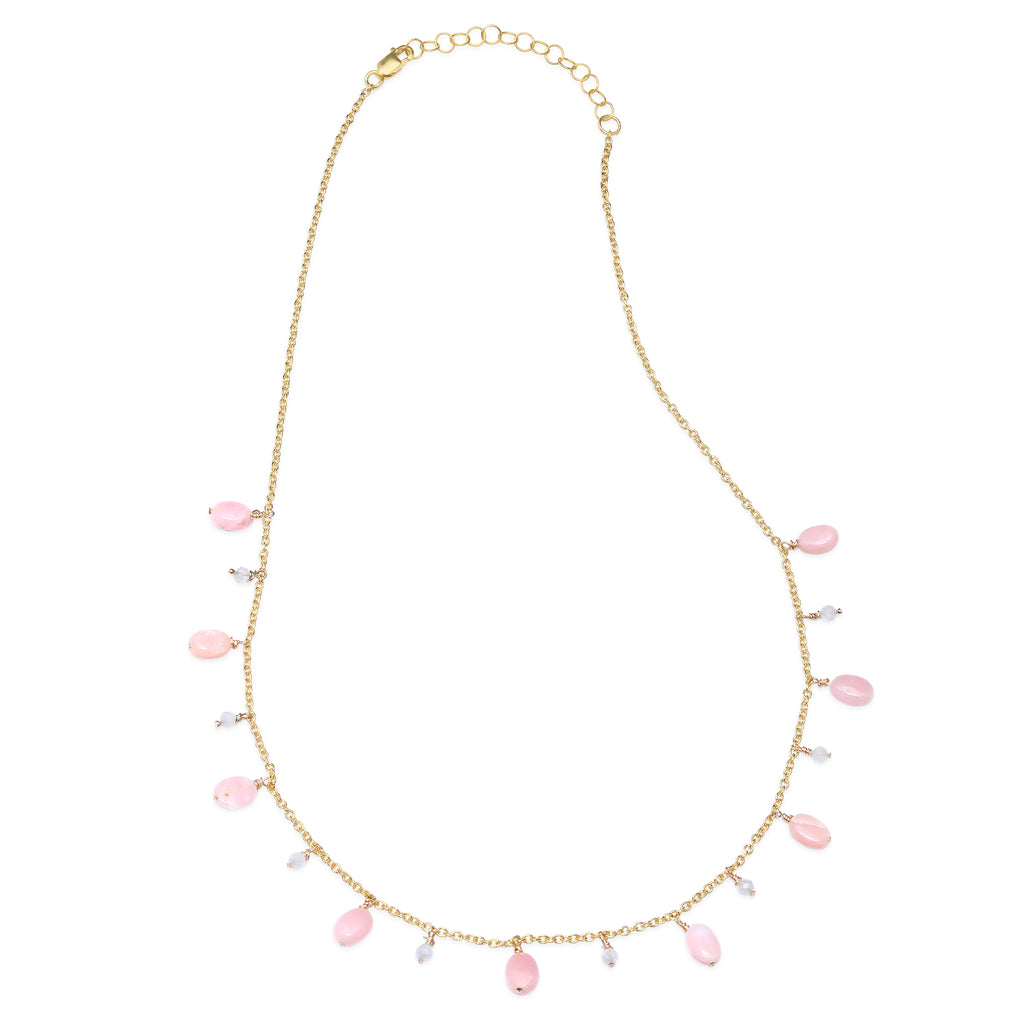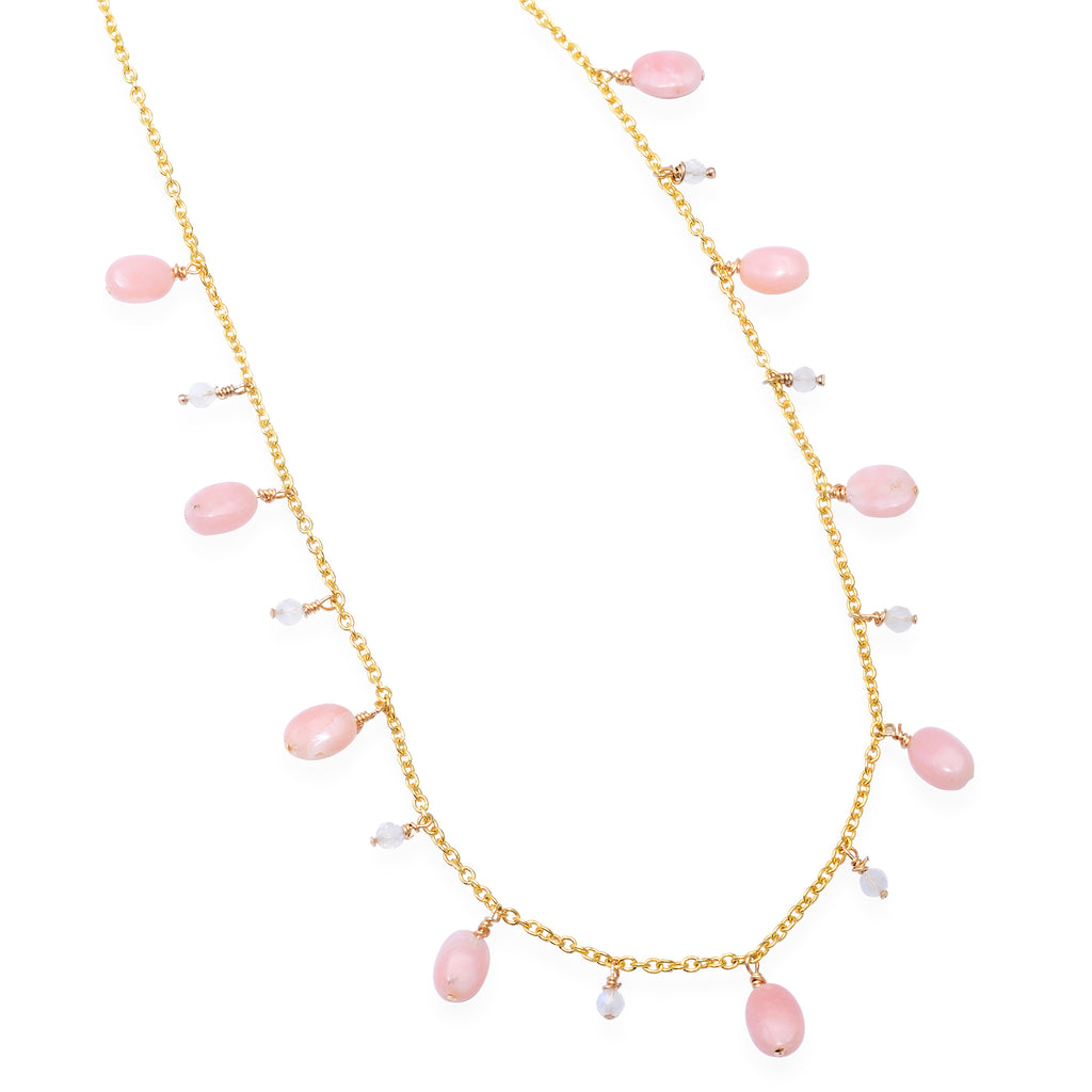 Small pink opals & flashy moonstones dangle from delicate chain for this stunning piece. The bubblegum-pink hue of the opals adds a feminine delight. Add this well-crafted necklace to your collection. Exquisite alone, or even more stunning when layered with other necklaces to create a personal combination.